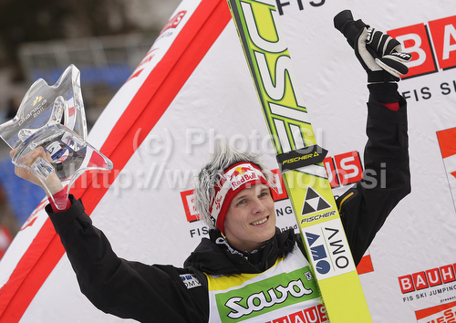 : Second placed Thomas Morgenstern of Austria celebrate his medal won in day 1 of FIS ski jumping World Cup 2010-2011 finals in Planica, Slovenia. Individual competition on first day of FIS ski jumping World cup finals was held on Friday, 18th of March 2011, in Planica, Slovenia.