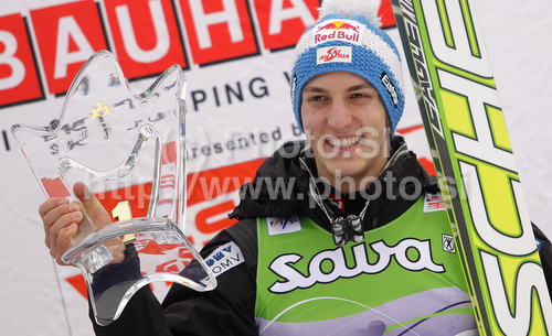 Planica ,Slovenia - 18.03.2011 : Winner Gregor Schlierenzauer of Austria celebrate his medal won in day 1 of FIS ski jumping World Cup 2010-2011 finals in Planica, Slovenia. Individual competition on first day of FIS ski jumping World cup finals was held on Friday, 18th of March 2011, in Planica, Slovenia. Photo by: Primoz Jeroncic