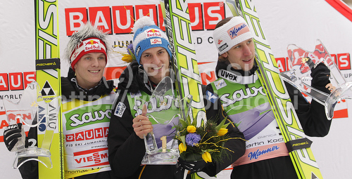 : Winner Gregor Schlierenzauer of Austria (M), second placed Thomas Morgenstern of Austria (L) and third placed Martin Koch of Austria (R) celebrate their medals won in day 1 of FIS ski jumping World Cup 2010-2011 finals in Planica, Slovenia. Individual competition on first day of FIS ski jumping World cup finals was held on Friday, 18th of March 2011, in Planica, Slovenia.