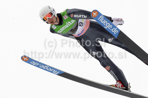 : Stephan Hocke of Germany soars through the air during first round of day 2 of FIS ski jumping World Cup 2010-2011 finals in Planica, Slovenia. Team competition on second day of FIS ski jumping World cup finals was held on Saturday, 19th of March 2011, in Planica, Slovenia.
