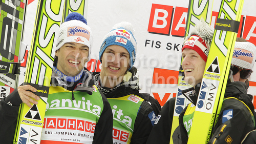 : Winning team of Austria with Thomas Morgenstern, Andreas Kofler, Martin Koch and Gregor Schlierenzauer celebrate their medals won in day 2 of FIS ski jumping World Cup 2010-2011 finals in Planica, Slovenia. Team competition on second day of FIS ski jumping World cup finals was held on Saturday, 19th of March 2011, in Planica, Slovenia.