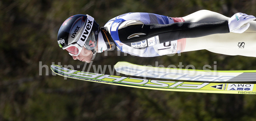 : Second placed Robert Kranjec of Slovenia soars through the air during first round of day 3 of FIS ski jumping World Cup 2010-2011 finals in Planica, Slovenia. Last individual competition of season on day 3 of FIS ski jumping World cup finals was held on Sunday, 20th of March 2011, in Planica, Slovenia.