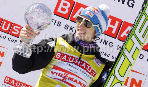 : Gregor Schlierenzauer of Austria celebrates Ski flying World cup overall medal won in FIS ski jumping World Cup 2010-2011. Final race of FIS ski jumping World cup 2010-2011 was held on Sunday, 20th of March 2011, in Planica, Slovenia.
