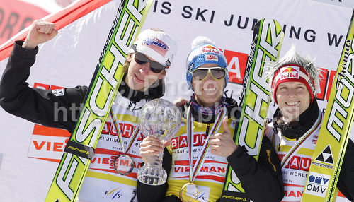 : Winner Gregor Schlierenzauer of Austria (M), second placed Martin Koch of Austria (L) and third placed Thomas Morgenstern of Austria (R) celebrate Ski flying World cup overall medal won in FIS ski jumping World Cup 2010-2011. Final race of FIS ski jumping World cup 2010-2011 was held on Sunday, 20th of March 2011, in Planica, Slovenia.