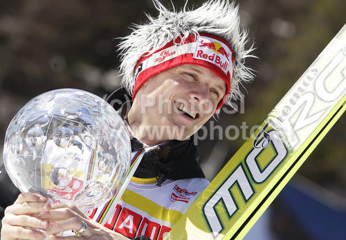 Planica ,Slovenia - 20.03.2011 : Winner Thomas Morgenstern of Austria celebrates World cup overall medal won in FIS ski jumping World Cup 2010-2011. Final race of FIS ski jumping World cup 2010-2011 was held on Sunday, 20th of March 2011, in Planica, Slovenia. Photo by: Primoz Jeroncic