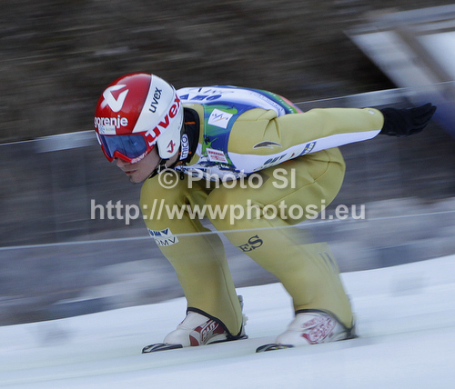 : Robert Kranjec of Slovenia on inrun during trial round of Flying hill individual competition of FIS World cup ski jumping finals in Planica, Slovenia. Flying hill Individual competition FIS World ski jumping finals was held on Friday, 16th of March 2012, in Planica, Slovenia.
