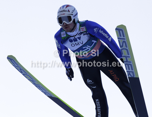 : Simon Ammann of Switzerland soars through the air during 1st round of Flying hill individual competition of FIS World cup ski jumping finals in Planica, Slovenia. Flying hill Individual competition FIS World ski jumping finals was held on Friday, 16th of March 2012, in Planica, Slovenia.