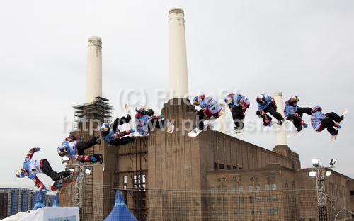 : A blended shot of a snowboarder takes to the air competing in the training session of the FIS Snowboard Big Air World Cup and freestyle skiing show at the London Freeze Festival at Battersea Power Station, London.