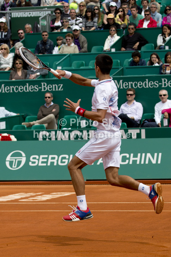: Novak Djokovic (SRB) in action during the second round match between Novak Djokovic (SRB) and Andreas Seppi (ITA) at the ATP Monte Carlo Masters tennis tournament held in the Monte Carlo Country Club, Monaco..