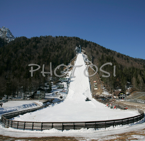: With 3 weeks to go, ski flying hill in Planica, Slovenia is slowly getting its final shape. Workers are preparing for FIS Ski jumping World Cup finals, which will be held in Planica, Slovenia between 13th and 16th of March 2008. Snow canons are resting already, since organizers provided enough snow to cover ski jumping hill even though current temperatures go up to +10 degrees.