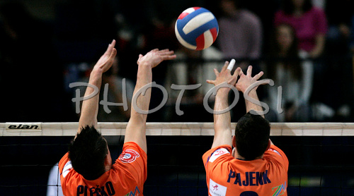 : Matija Plesko of ACH Volley Bled (L) and Alen Pajenk of ACH Volley Bled (R) in block during first match of Slovenian National Championships finals between ACH Volley, Bled, Slovenia and OK Salonit Anhovo, Slovenia. Match was won by ACH Volley Bled who defeated OK Salonit Anhovo with 3:0. Match was played in Radovljica, Slovenia on 12th of April 2008.