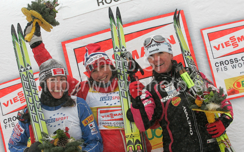 : Winner Marit Bjoergen of Norway (M), second placed Justyna Kowalczyk of Poland (L) and third placed Petra Majdic of Slovenia (R) celebrating their medals won in Women sprint race of Viessmann Cross country skiing FIS World Cup 2009-10. Women sprint race of Viessmann Cross country skiing FIS World Cup were held in Rogla, Slovenia, on 19th of December 2009.
