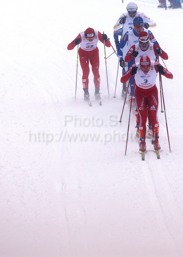 Rogla ,Slovenia - 19.12.2009 : Dario Cologna of Switzerland leading the group during finals of Men sprint race of Viessmann Cross country skiing FIS World Cup 2009-10. Men sprint race of Viessmann Cross country skiing FIS World Cup were held in Rogla, Slovenia, on 19th of December 2009. Photo by: Leena Jeroncic