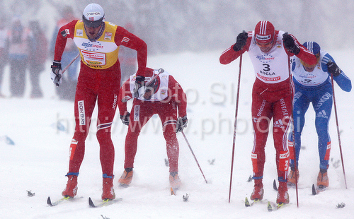: Petter Northug of Norway (L), Dario Cologna of Switzerland (R) skiing during finals of Men sprint race of Viessmann Cross country skiing FIS World Cup 2009-10. Men sprint race of Viessmann Cross country skiing FIS World Cup were held in Rogla, Slovenia, on 19th of December 2009.