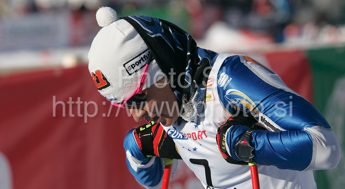 : Riitta-Liisa Roponen of Finland in finish of Women 15km classic mass start race of Viessmann Cross country skiing FIS World Cup 2009-10. Women 15km classic mass start race of Viessmann Cross country skiing FIS World Cup were held in Rogla, Slovenia, on 20th of December 2009.
