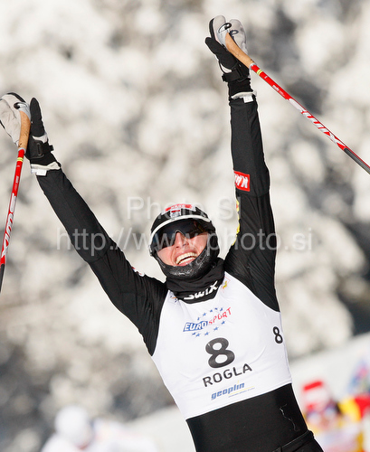Rogla ,Slovenia - 20.12.2009 : Winner Justyna Kowalczyk of Poland celebrating her victory when crossing finish line of Women 15km classic mass start race of Viessmann Cross country skiing FIS World Cup 2009-10. Women 15km classic mass start race of Viessmann Cross country skiing FIS World Cup were held in Rogla, Slovenia, on 20th of December 2009. Photo by: Leena Jeroncic