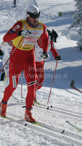 : Winner Petter Northug of Norway skiing in Men 30km classic mass start race of Viessmann Cross country skiing FIS World Cup 2009-10. Men 30km classic mass start race of Viessmann Cross country skiing FIS World Cup were held in Rogla, Slovenia, on 20th of December 2009.