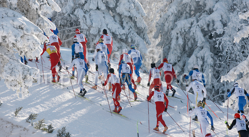 : Skiers skiing in Men 30km classic mass start race of Viessmann Cross country skiing FIS World Cup 2009-10. Men 30km classic mass start race of Viessmann Cross country skiing FIS World Cup were held in Rogla, Slovenia, on 20th of December 2009.