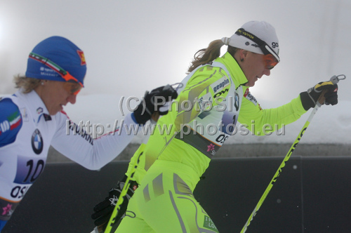 : Petra Majdic of Slovenia, and Marianna Longa of Italy skiing in team sprint race of FIS Nordic skiing World championships in Oslo, Norway. Team sprint race of FIS Nordic skiing World championships was held on Holmenkollen above Oslo, Norway, on Wednesday, 2nd of March 2011.