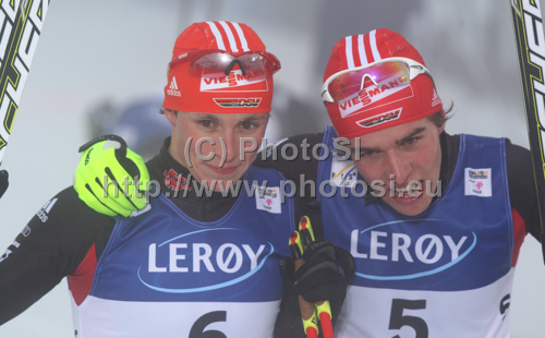 : Eric Frenzel and Johannes Rydzek of Germany celebrate their medals won in nordic combined race FIS Nordic skiing World championships in Oslo, Norway. Nordic combined race of FIS Nordic skiing World championships was held on Holmenkollen above Oslo, Norway, on Wednesday, 2nd of March 2011.