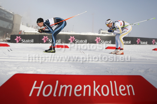 : Pirjo Muranen of Finland and Ida Ingemarsdotter of Sweden skiing in women 4x5km relay race of FIS Nordic skiing World championships in Oslo, Norway. Women 4x5km relay race of FIS Nordic skiing World championships was held on Holmenkollen above Oslo, Norway, on Thursday, 3rd of March 2011.
