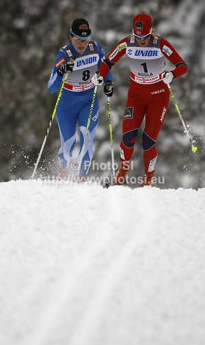 : Vibeke Skofterud of Norway in front of Aino-Kaisa Saarinen of Finland skiing during women 10km classic race of FIS cross country skiing World cup race in Rogla, Slovenia. Women 10km classic race of FIS cross country skiing World cup was held on Rogla, Slovenia, on Saturday, 17th of December 2011.