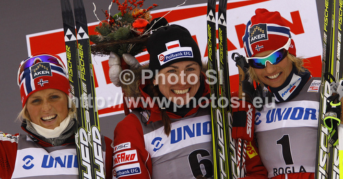 Rogla ,Slovenia - 17.12.2011 : Winner Justyna Kowalczyk of Poland (M), second placed Therese Johaug of Norway (L) and third placed Vibeke Skofterud of Norway (right) celebrate their medals won in women 10km classic race of FIS cross country skiing World cup race in Rogla, Slovenia. Women 10km classic race of FIS cross country skiing World cup was held on Rogla, Slovenia, on Saturday, 17th of December 2011. Photo by: Primoz Jeroncic
