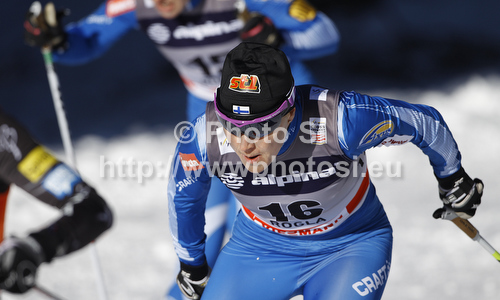 : Aino-Kaisa Saarinen of Finland skiing during finals of women sprint free style race of FIS cross country skiing World cup race in Rogla, Slovenia. Women sprint race of FIS cross country skiing World cup was held on Rogla, Slovenia, on Sunday, 18th of December 2011.