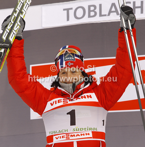 : Winner Marit Bjoergen of Norway celebrates her medal won in women sprint free style race of Tour de Ski race of FIS cross country skiing World cup race in Toblach-Dobbiaco, Italy. Women sprint race, stage 6 of Tour de Ski and FIS cross country skiing World cup was held on Toblach-Dobbiaco, Italy, on Wednesday, 4th of January 2012.