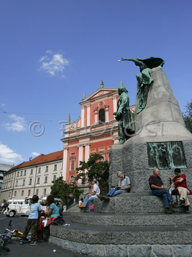 Ljubljana ,Slovenia - 10.09.2006 : Tromostovje (the Triple Bridge) with The Franciscan monastery and the Church of the Annunciation and the Presernov trg Square on background on nice late summer day. In late summer when temperatures are still around 25 degres Celsius, Slovene capital city Ljubljana is still crammed with tourists from all over the world, who are discovering city secrets by foot. Photo by: Primoz Jeroncic/PhotoSI