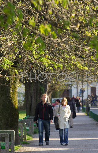 : People are enjoying sunny and warm spring day in middle of Slovene capital city Ljubjana, Slovenia.