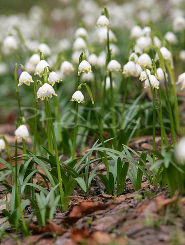 : Spring snowflake flowers are growing on edge of forest near village small village Brdo, Slovenia. Spring Snowflake which is also known as St. Josephs Bells (Leucojum vernum) is early spring flower which gives sign to people that winter is definitely over.