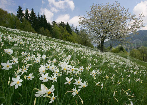 Golica ,Slovenia - 07.05.2006 : Daffodil flowers (Narcissus poeticus) are starting to bloom on meadows under Golica, Slovenia. Meadows under Golica, Slovenia, are famous for their carpets of daffodil flowers which start to bloom in begining of May. Daffodil flowers cover all grass fields on hills and valleys of meadows under mountain Golica above Jesenice, Slovenia. Photo by: Primoz Jeroncic/PhotoSI