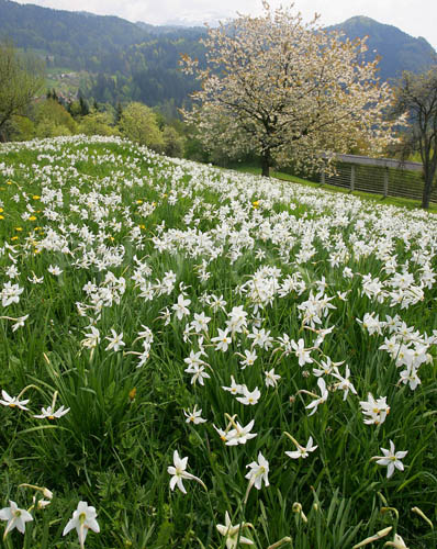 : Daffodil flowers (Narcissus poeticus) are starting to bloom on meadows under Golica, Slovenia. Meadows under Golica, Slovenia, are famous for their carpets of daffodil flowers which start to bloom in begining of May. Daffodil flowers cover all grass fields on hills and valleys of meadows under mountain Golica above Jesenice, Slovenia.