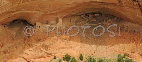 : Ruins of House under the Rock below in Canyon de Chelly. Canyon de Chelly National Monument is located near Chinle, AZ, USA and is hiding numerous house ruins of Navajo Indians, which were settled in Canyon de Chelly. Labyrinth called Canyon de Chelly is really several canyons, which include Canyon de Chelly and Canyon del Muerto. At the mouth of the canyon the rock walls are only 30 feet high. Deeper into the canyons, to the east, the walls rise dramatically until they reach more than 1000 feet above the floor. The cliffs rise straight up, overshadowing the streams, cottonwoods, and small farms below. It has taken about two million years and volumes of water to etch these stone paths through the layers of sandstone and igneous rock as the Defiance Plateau pushed its way upward. Today the canyon still beckons us with its towering stone monoliths and ledges bearing the open windows of ancient people.
