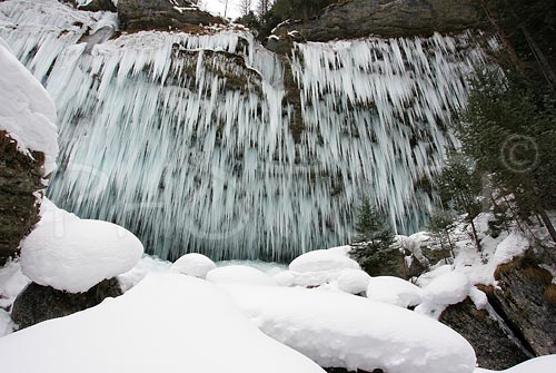 : After longer periode of extremly cold weather, where temperatures in last week were way below -20 degres of Celsius, waterfall Pericnik turned into numerous big icicles. Short, little bit warmer period with temperatures between 0 and -5 degrees of Celsius some of icicles started to break and fall off the wall, making stay under frozen waterfall dangerous doings.