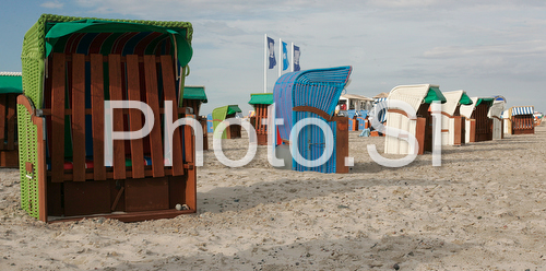 : Beach chairs are abandoned in windy summer evening on sandy beaches of North Germanys tourist resort Warnemunde. Temperatures around +18 degres of Celsius and strong wind made bathers to leave early, and wind had its own way to play with sand and beach equipment on endless Baltic sandy beaches.