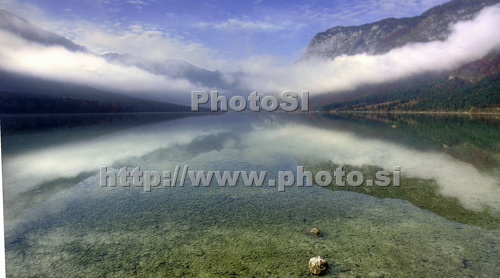 : Autumn dressed surrounding of Bohinj lake into beautiful fall colors. Lake Bohinj lies between Bohinjs mountains, which rise from 1600 to 2000 meters, and is Slovenias largest glacial lake. It is 4.2 kilometers long, one kilometer wide, and forty-five meters deep. Bohinj is a valley that stretches from Soteska to Ukanc. On the south side, it is enclosed by the Lower Bohinj Mountains, which rise to 2.000 meters, and on the north by the Triglav mountain range with 2864m high Mount Triglav, Slovenias highest mountain.