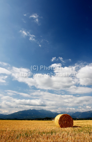 : Wheat hay is rolled and waiting for transportation after wheat was harvested on sunny and hot summer afternoon of 19th of July 2010. Wheat fields are located near village Menges, Slovenia.