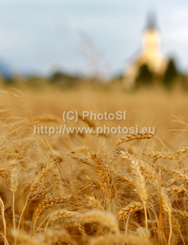 : Gold yellow wheat is waiting to be harvested on hot sunny summer afternoon of 19th of July 2010 on fields near Britof, Slovenia.