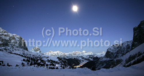 : Landscape around Gardena pass in Val Gardena, Italy on cold winter evening of 18th of December 2010.