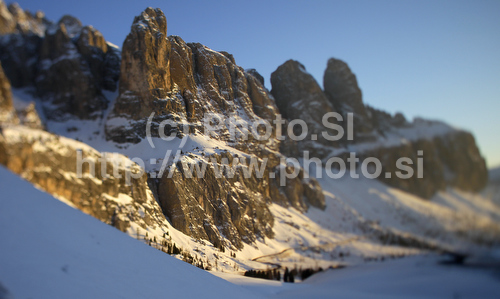 : Landscape with high Dolomite mountains around Gardena pass in Val Gardena, Italy on late winter evening of 11th of March 2011.