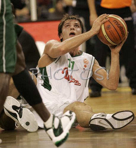 Ljubljana ,Slovenia - 08.11.2006 : Manuchar Markoishvili (no. 11) of Union Olimpija is fighting for ball even when he is on floor already.Match between Union Olimpija and Panathinaikos Athens ended with victory of Panathinaikos, who defeated Union Olimpija with 86:65. Match between KK Union Olimpija and Panathinaikos was played in Tivoli hall in Ljubljana, Slovenia on 8. November 2006. Photo by: Primoz Jeroncic/PhotoSI