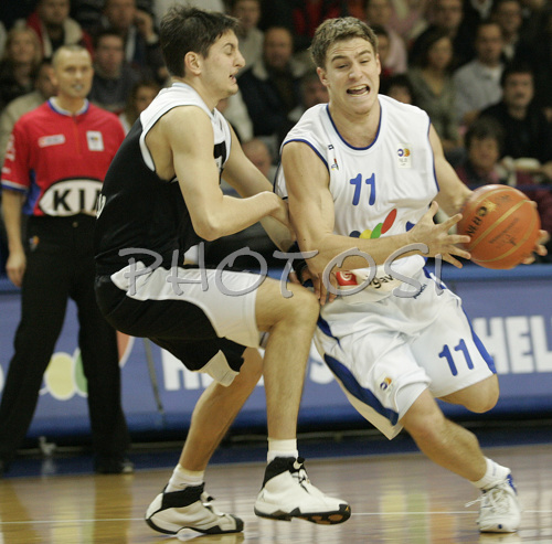Domzale ,Slovenia - 13.01.2007 : Ziga Zagorc (no.11) of Helios Domzale (R) and Boris Bakic (no.8) of Partizan (L) during match of 17th round of Basketball NLB League between Helios Domzale, Slovenia and Partizan Beograd, Serbia. Match ended with victory of Helios Domzale, who defeated Partizan with 79:76. Match between Helios Domzale and Partizan was played in Domzale, Slovenia on 13. January 2007. Photo by: Primoz Jeroncic/PhotoSI