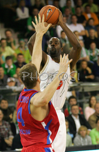 : Chris Booker (no.6) of Union Olimpija shooting over Aleksey Savrasenko (no.14) of CSKA Moscow during match of 3nd round of Basketball Euroleague between Union Olimpija, Ljubljana, Slovenia and CSKA Moscow, Russia. Match ended with victory of Union Olimpija, who defeated CSKA Moscow with 74:72. Match between KK Union Olimpija and CSKA was played in Tivoli Arena in Ljubljana, Slovenia on 7. November 2007.