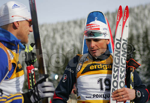 : Portrait of Raphael Poiree of France (R) and Carl Johan Bergman of Sweden (L) after men sprint race of e.on Ruhrgas IBU Biathlon World cup which was held on Pokljuka, Slovenia on 8.March 2006.