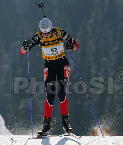 : Second placed Sandrine Bailly of France skiing during women sprint race of e.on Ruhrgas IBU Biathlon World cup which was held on Pokljuka, Slovenia on 9.March 2006.