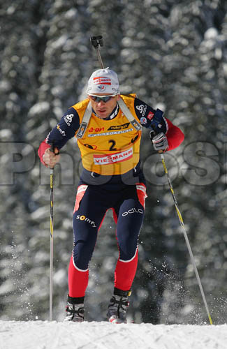 Pokljuka ,Slovenia - 11.03.2006 : Second placed Raphael Poiree of France skiing during men pursuit race of e.on Ruhrgas IBU Biathlon World cup which was held on Pokljuka, Slovenia on 11.March 2006. Photo by: Primoz Jeroncic/PhotoSI
