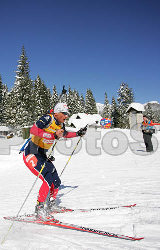 : Second placed Raphael Poiree of France skiing during men pursuit race of e.on Ruhrgas IBU Biathlon World cup which was held on Pokljuka, Slovenia on 11.March 2006.