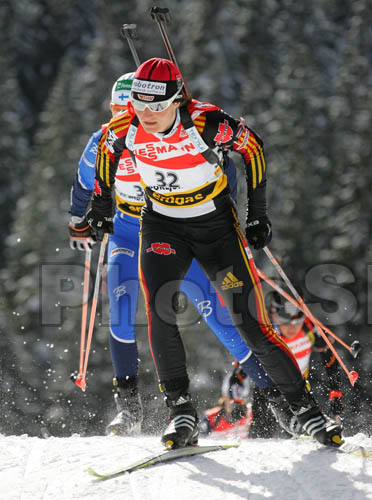 : Katja Beer of Germany skiing during women pursuit race of e.on Ruhrgas IBU Biathlon World cup which was held on Pokljuka, Slovenia on 11.March 2006.